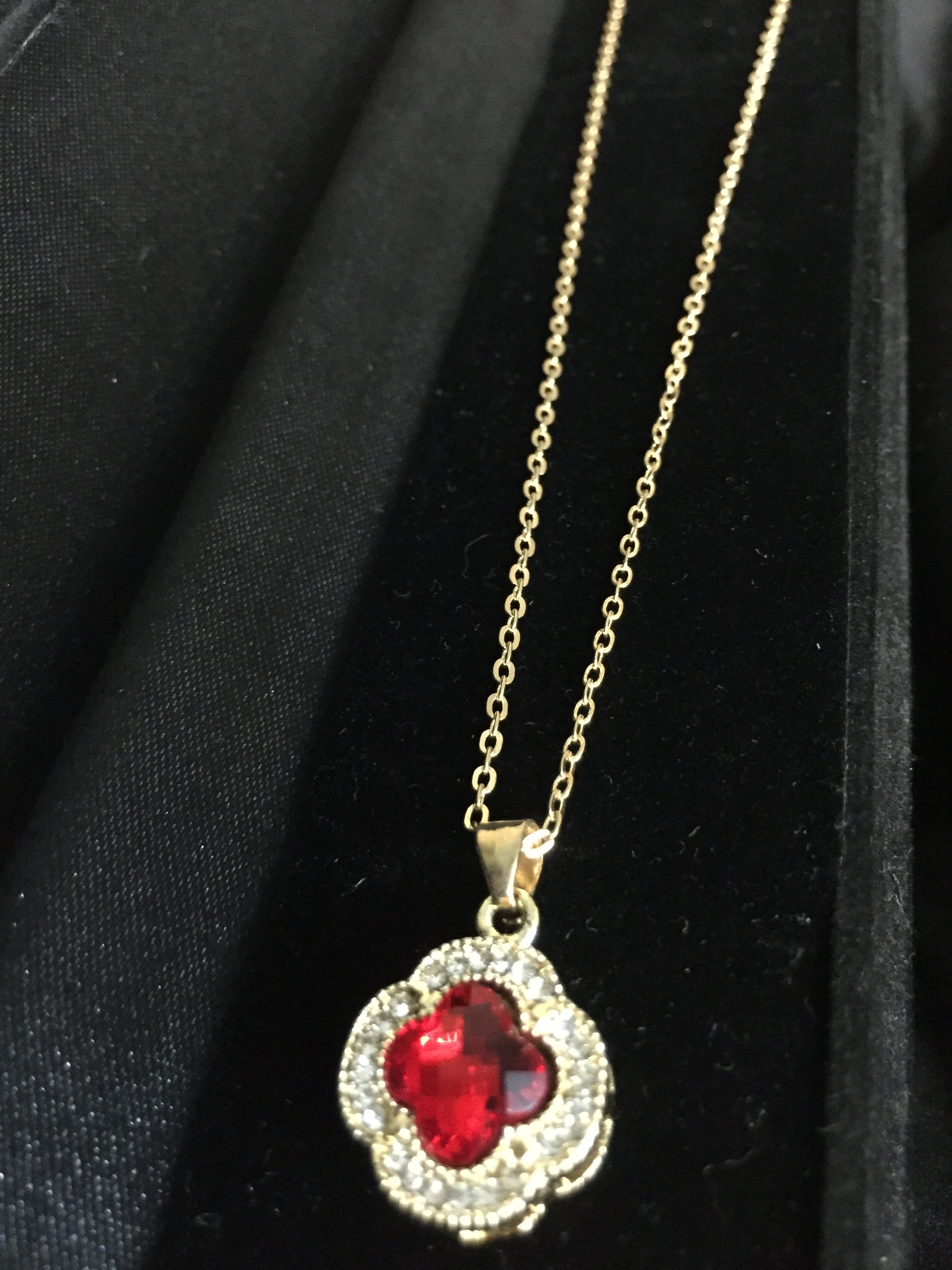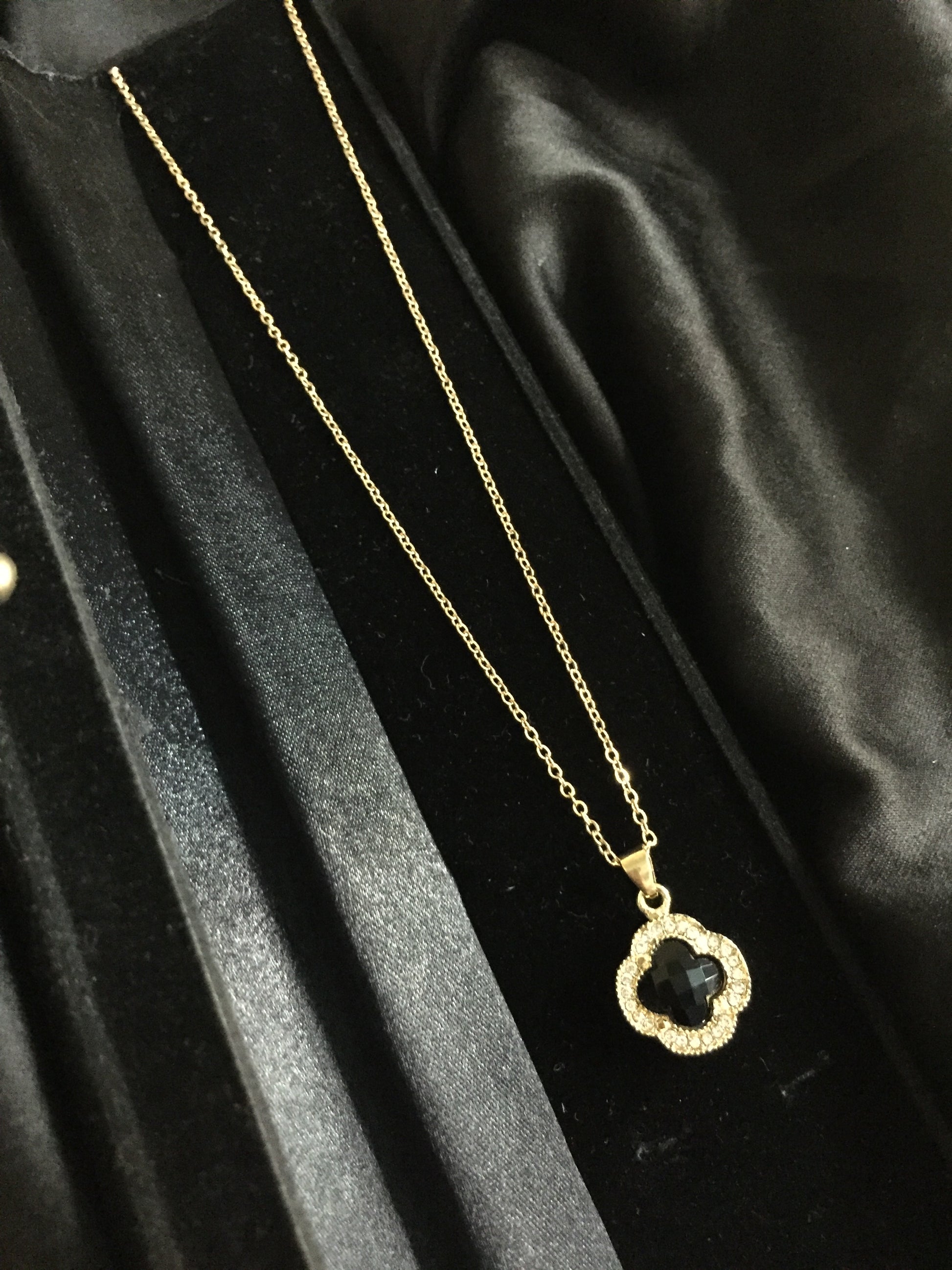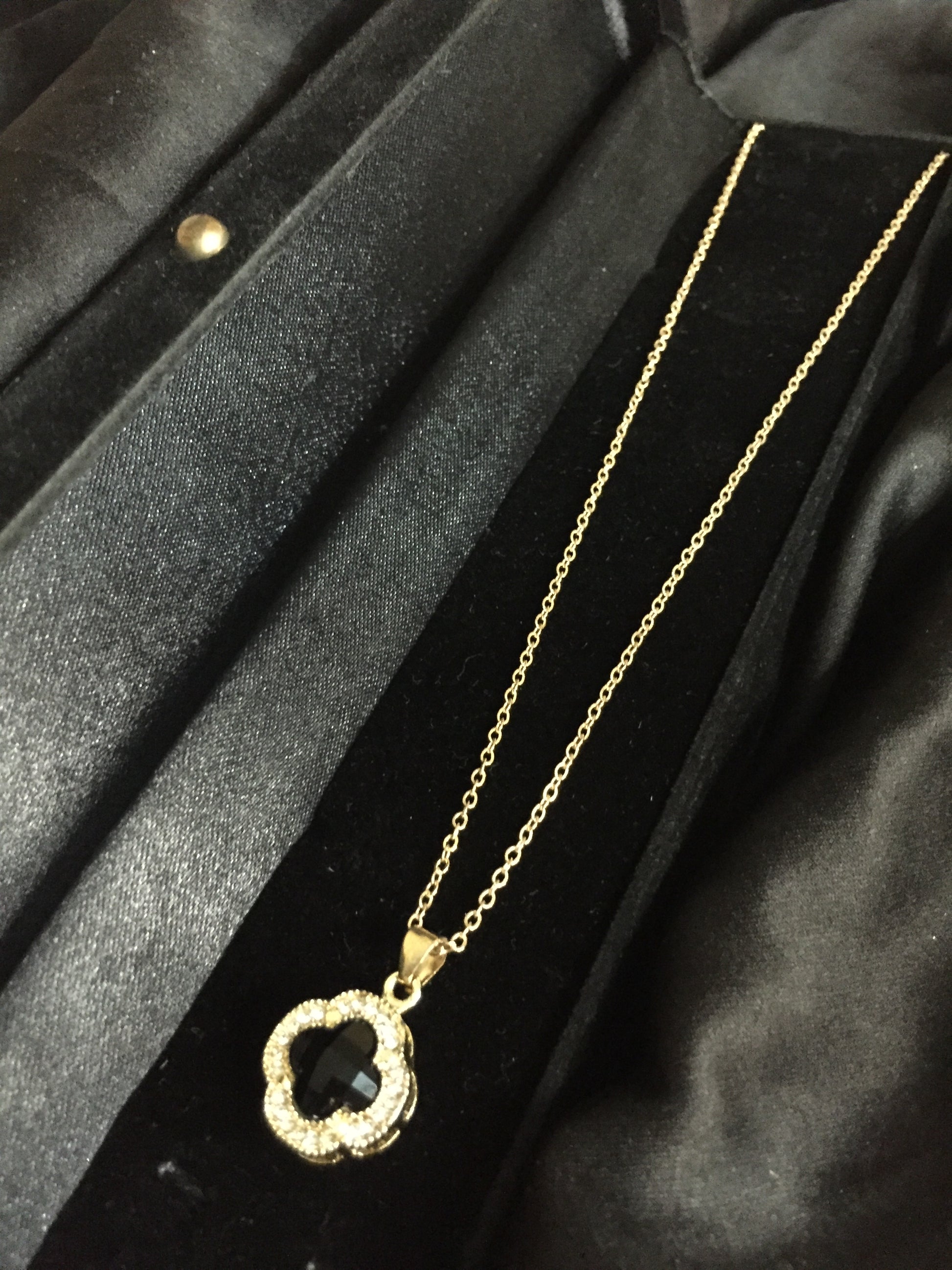 - Add a touch of timeless elegance to your look with this stunning clover-shaped pendant necklace. Featuring a bold black gemstone at the center, beautifully framed by sparkling crystal accents, this piece combines sophistication with modern charm. The delicate chain and refined design make it perfect for both casual wear and special occasions.