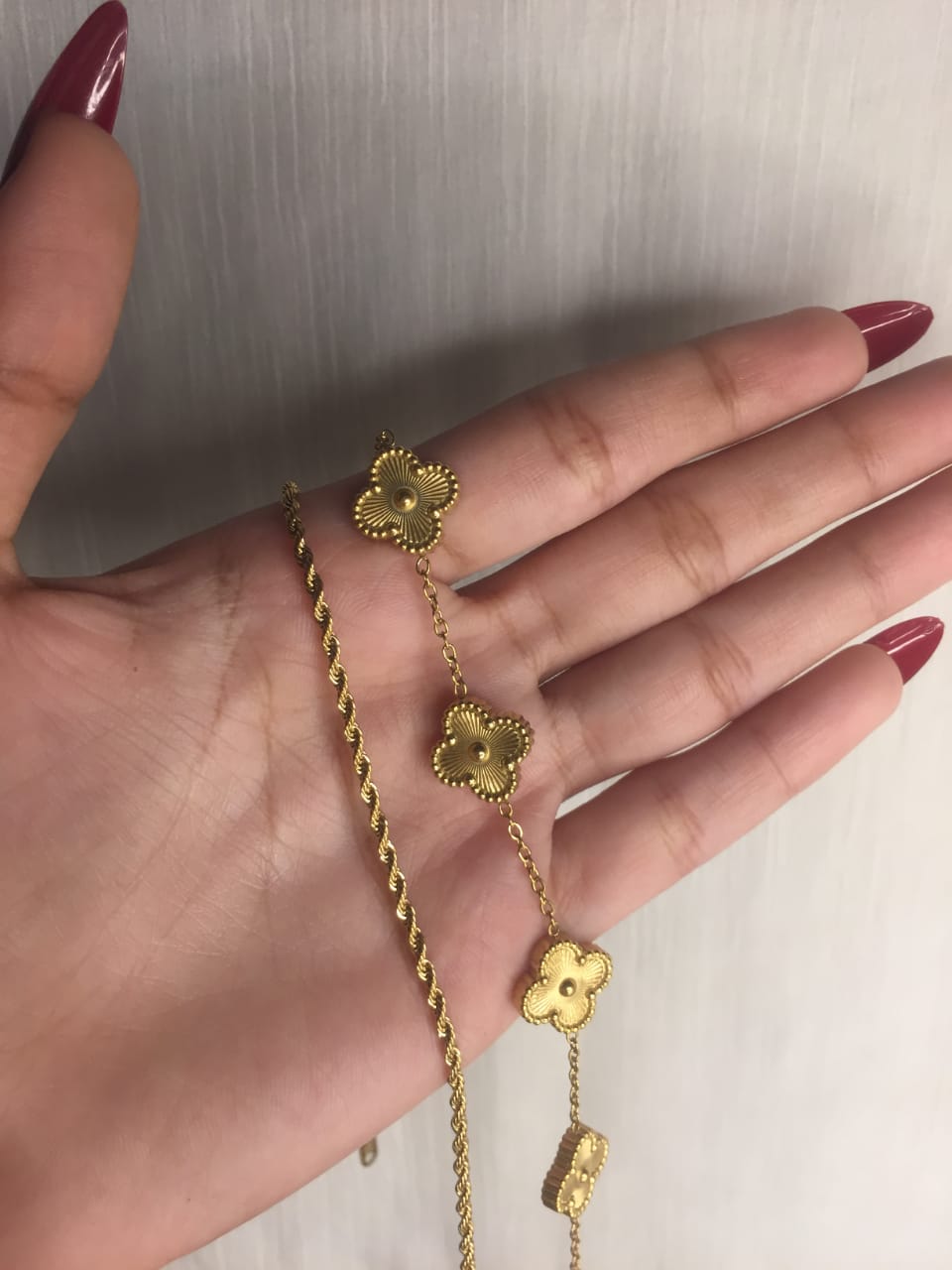 This image shows a delicate gold chain necklace or bracelet featuring intricately designed floral charms evenly spaced along the chain. The chain itself has a twisted rope design, adding an elegant texture. The floral charms have a detailed, embossed pattern that enhances their traditional yet timeless appeal, making this piece perfect for festive or formal occasions.