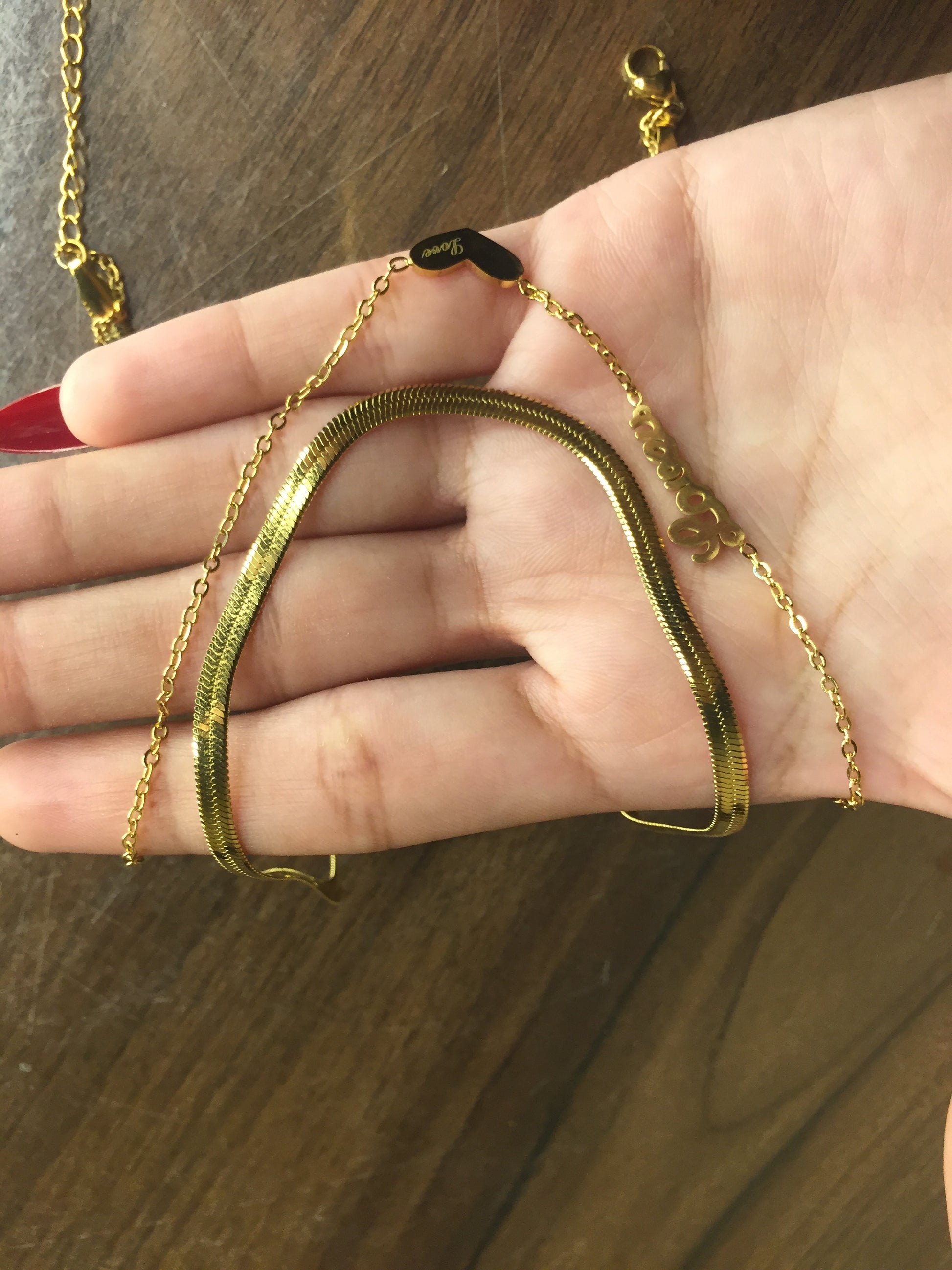 Elevate your style with this chic layered necklace set. Featuring a sleek gold snake chain paired with a delicate link chain adorned with a heart charm engraved with Love and a stylish “Love” text design. This versatile piece is perfect for adding elegance to casual outfits or a romantic touch to evening wear.